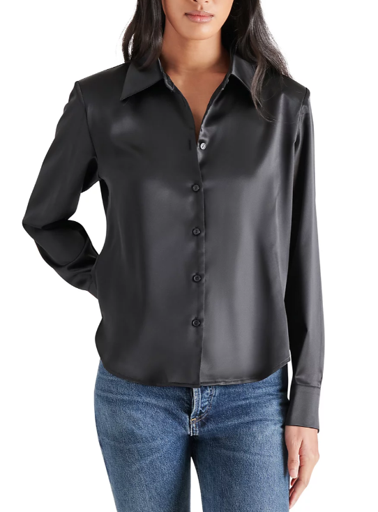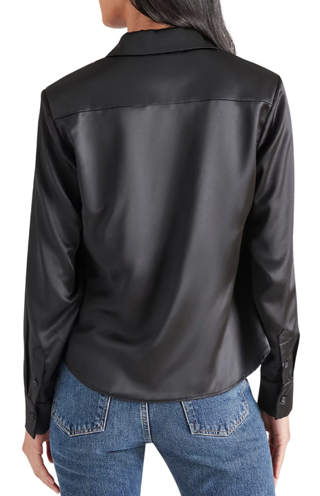 This silky satin blouse has an easy elegance to it, with button up front, collared neckline, and long sleeves.