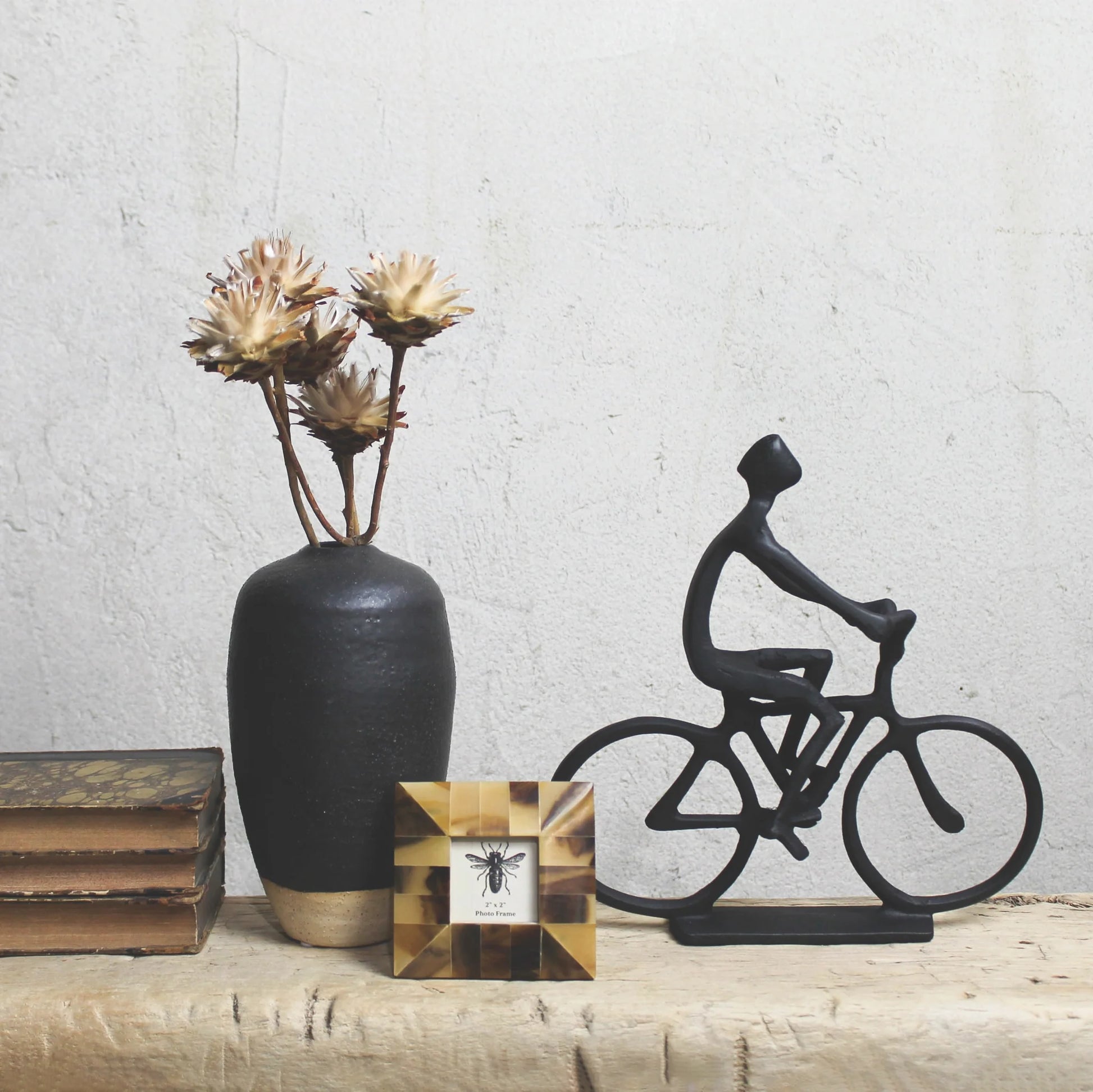 Bicyclist statue cast of aluminum with a matte black finish inspires the athlete from indoors to outdoors. Dimensions 9.5 x 2.5 x 9.5