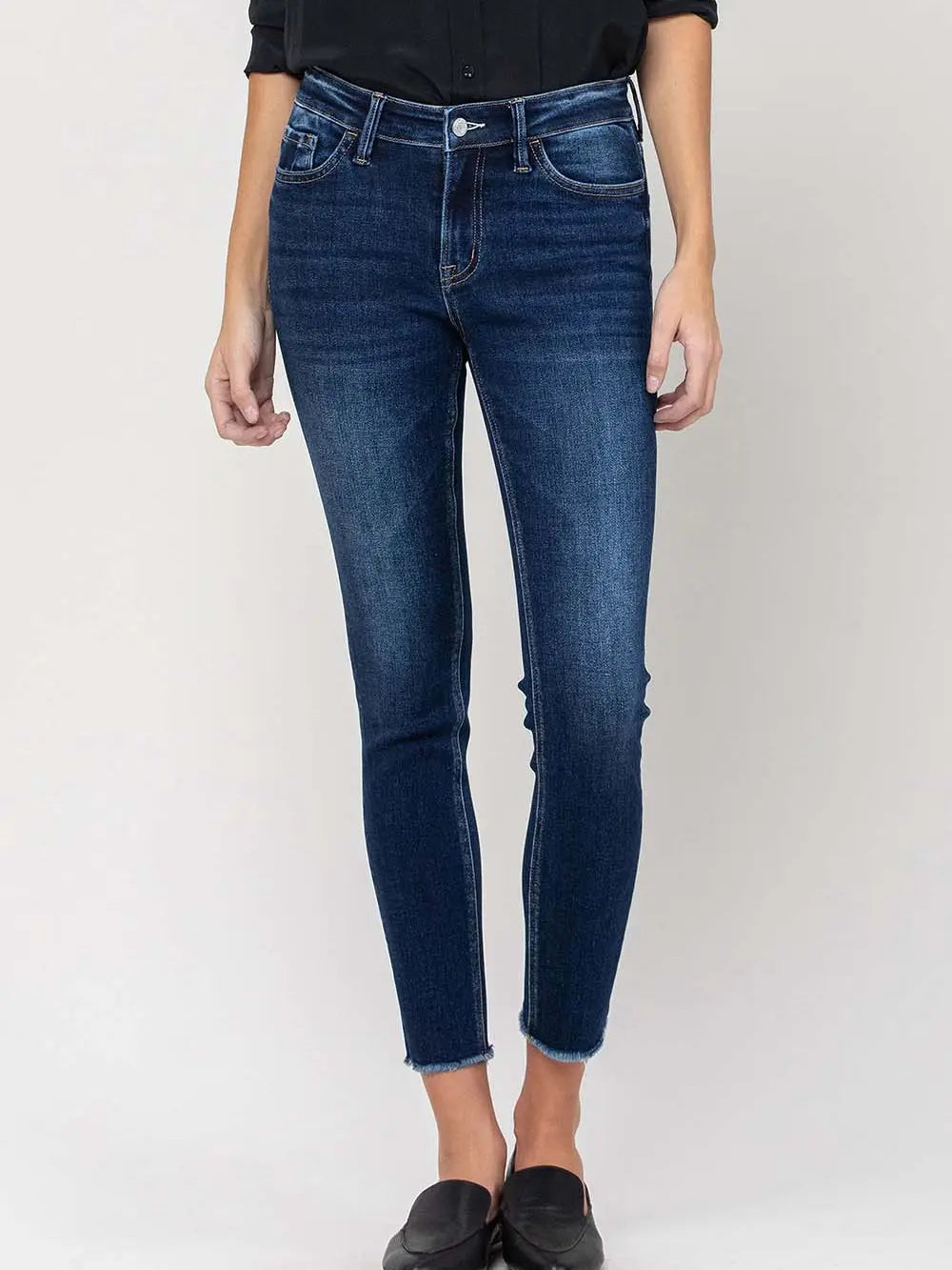 Mid Rise Stretch Straight Leg Raw Hem Jean