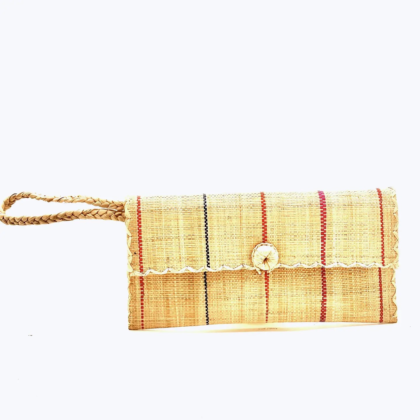 Made from loomed raffia palm fiber, it features a wrapped button and wristlet loop for added convenience. It packs flat for extra functionality.
